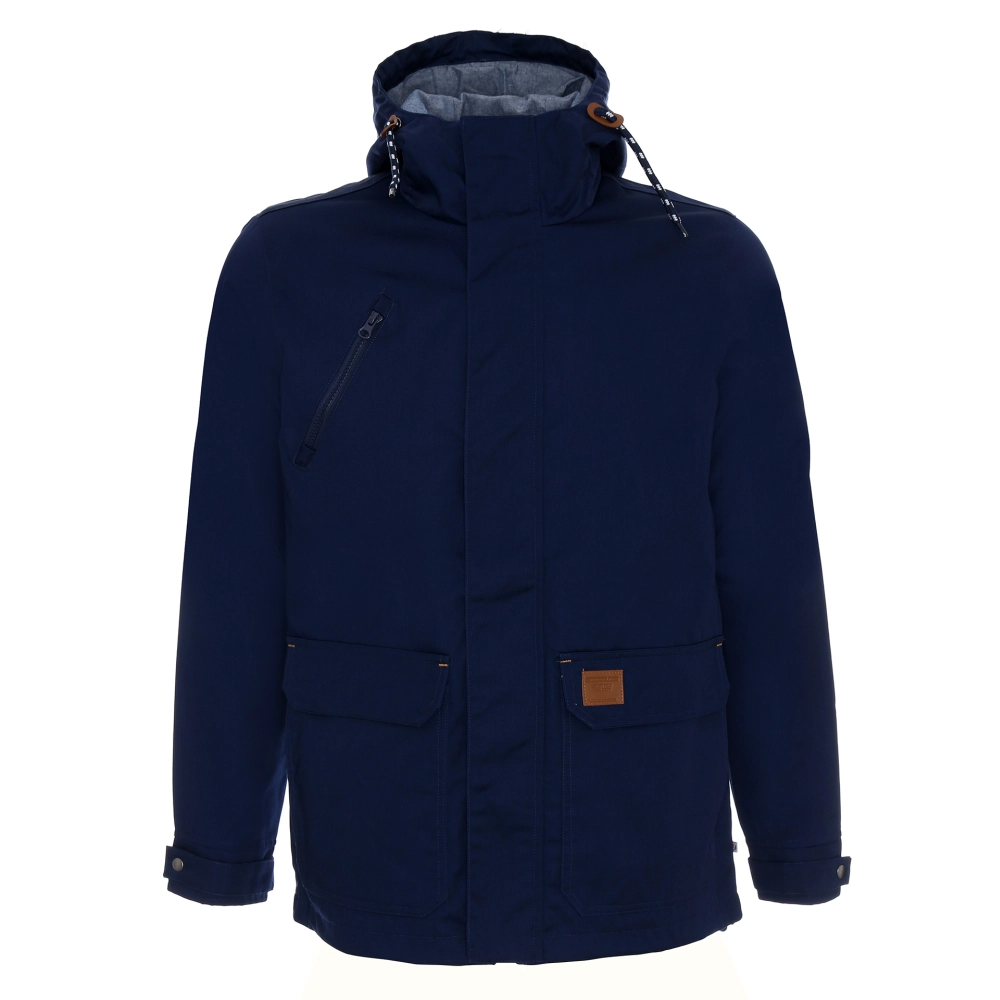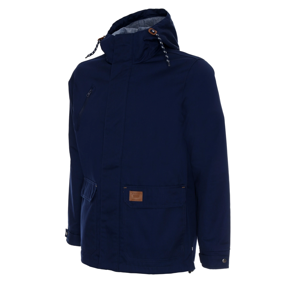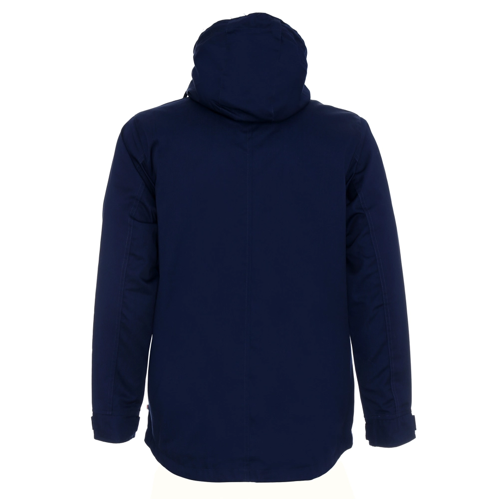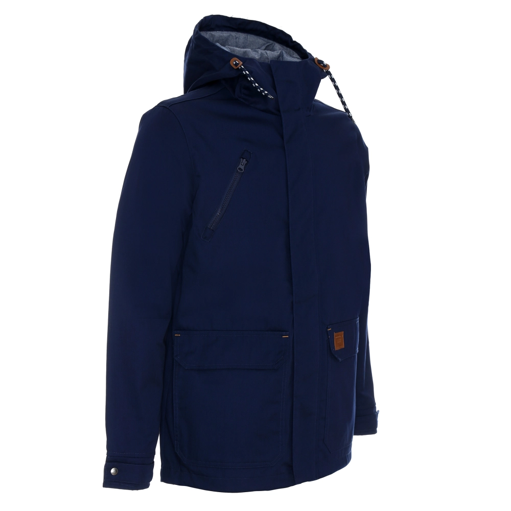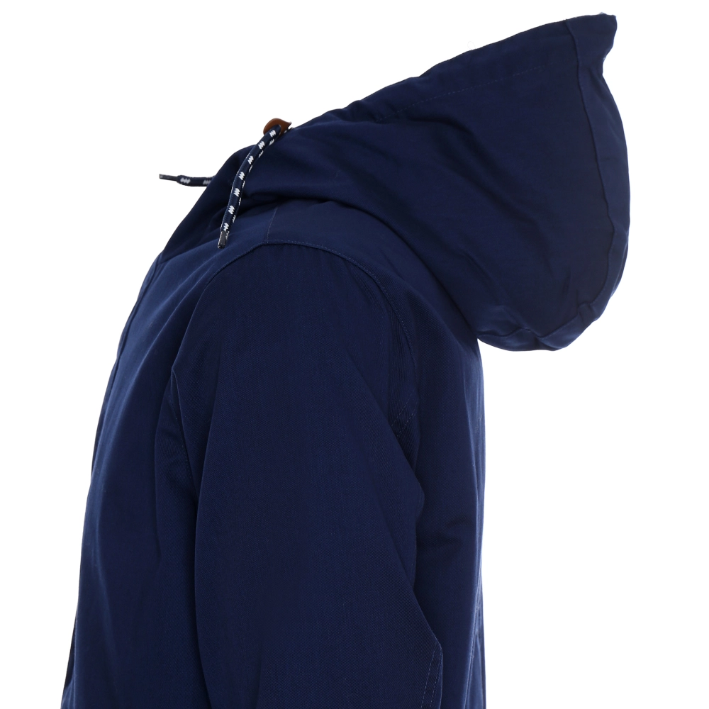lekka kurtka wiosenno-jesienna z podszewką; materiał typu twill; materiał kontrastowy wew. kaptura; kieszeń na piersi zamykana na zamek; podwójne kieszenie dolne; wewnątrz kieszeń na dokumenty, ozdobny sznurek w regulacji kaptura