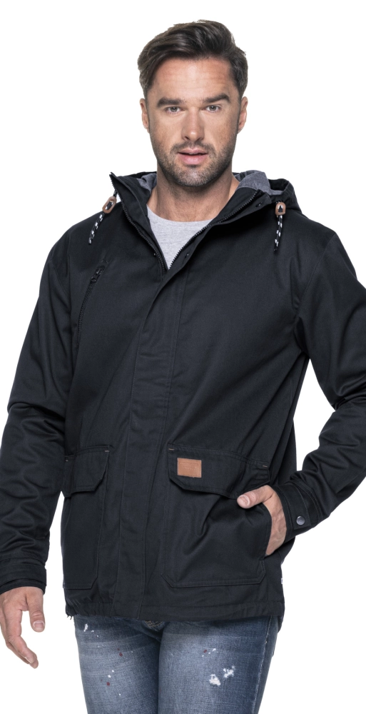 lekka kurtka wiosenno-jesienna z podszewką; materiał typu twill; materiał kontrastowy wew. kaptura; kieszeń na piersi zamykana na zamek; podwójne kieszenie dolne; wewnątrz kieszeń na dokumenty, ozdobny sznurek w regulacji kaptura